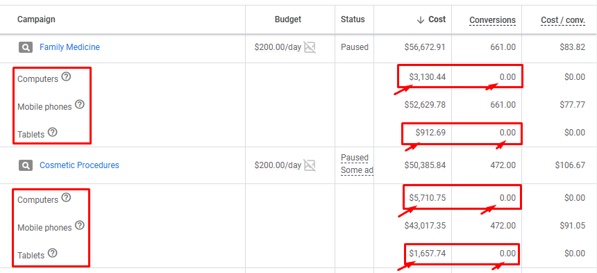 In the screenshot below you can see the budget leaks I found during the audit. Thousands were spent on computers and tablets with zero conversions, while mobile drives everything. When I see this, I either try improving the weak devices or move that wasted budget into what already works. Even this one tweak alone often boosts performance 20 to 30 percent.