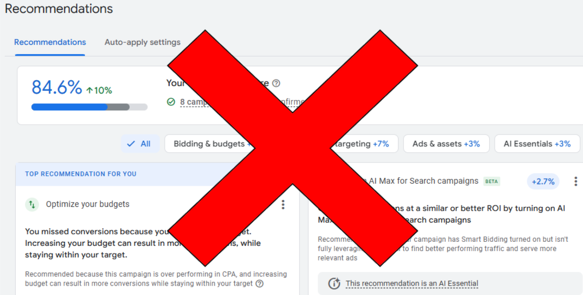 After the audit, my goal as a freelance Google AdWords specialist is simple: get your account back under control. I turn off auto-applied recommendations, ignore the “optimization score,” and focus on what actually benefits the business. A high score doesn’t help if it doesn’t help the client. Real PPC work means judging google’s suggestions, not blindly following them.
